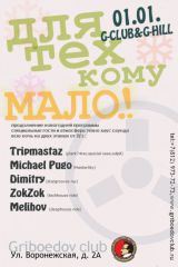 1 января ... Дорогой Друг , похмельная неделя в самом разгаре! ... только для вас на обоих этажах клуба- специальная атмосфера Анеграунд Техно Хаус Саунда всю ночь! .. Оливье и море Шампанского обеспечены! ... Dj’s & Live Special : Tripmastaz , Zok-Zok , Dimitry , Melihov ... Love Peace & Happiness !!!
