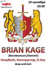 а так же dj’s: M. DeepBosh, Конструктор, O.K! (Deep-house, Tech-house, Techno, Minimal) Музыкант и продюсер Brian Kage родом из Детройта и это многое объясняет. Его музыка укладывается в рамки хорошо известных всем жанров — тут и лёгкое техно, и дип-хаус, но стилистические каноны у американца совершенно иные, чем мы привыкли слышать, например, от немецких артистов. В корнях его композиций неизменно лежит фанк — недаром детройтские «отцы» называли свою музыку «techno soul». Минимализму Кагей предпочитает музыкальность — фанковый бас, тёплые синтезаторные септаккорды, пространственные атмосферные подложки и обилие мелодических линий. Карьеру Кагей, как и многие электронщики, начинал в качестве диск-жокея. Брайан исколесил континент вдоль и поперек, выступая то в Сан-Диего, то в Нью-Йорке, то в Лос-Анджелесе, то в родном Мичигане, где он принимал участие в легендарном фестивале Fuse-In. В 2003-м вместе с Райаном Садорусом (Ryski) Брайан создаёт лейбл Barettamusic, где выходит целая серия его релизов, как сольных, так и совместных. Большой успех приходит к американцу два года спустя — сначала его подписывает известный франкфуртский нет-лейбл Thinner, а чуть позже на dLuv Recordings выходит пластинка «Cloned EP», при помощи которой Брайану удается атака сразу по нескольким направлениям — релиз пришелся по вкусу как техно-ортодоксам, так и любителям модернового тек-хауса. Треки оттуда немедленно оказались в плейлистах множества топовых диск-жокеев.