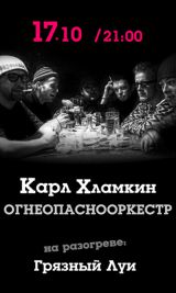 Новости / 21.00 концерт «Карл Хламкин и Огнеопаснооркестр» (Мск) на разогреве группа «Грязный Луи» (Мск)