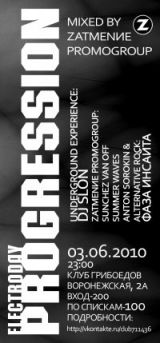 ПРОГРЕССИЯ и все что связано с этим словом: жизнь, музыка, технология и МЫ, впервые в клубе "Грибоедов«- промокомпания ZATMENИЕ — представляем вашему вниманию вечеринку из серии «ElectrodaY» — «ProgressioN». Встречаем вместе долгожданное ЛЕТО в самый разгар белых ночей. Лучшие стили электронной музыки: Techno . Breaks . Progressive, в сочетании с экспериментальным Video & Live Performance. Все для ВАС и ваших ДРУЗЕЙ. Line Up -