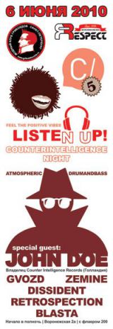 RESPECT Family пpиглaшaeт вcex друзей хорошей drum’n’bass мyзыки и позитивного мышления в убежище модного клуба ГРИБОЕДОВ на уникальную воскресную встречу из серии... LISTEN UP! COUNTER INTELLIGENCE Night. Общероссийская перепись живых анонимов от drum’n’bass интеллигенции ;] Специальный гость: JOHN DOE (Голландия) Владелец Counter Intelligence Records. John Doe впервые соприкоснулся с Drum’n’Bass в 1996 году благодаря своему другу Lennaart Raams, который слушал раннего Photek, Adam F и Roni Size. В 1998 году они начали вместе писать музыку под псевдонимом Movin Forward и выпустили 2 альбома house, breaks и drum’n’bass материала. В 2002 году он участвовал в основании весьма успешных потрясающих вечеринок в Тилбурге, которые проходят до сих пор с участием всемирно известных ди-джеев. В начале 2004 года Джон присоединился к Mav в команде Scientific, чтобы продвигать атмосферный Drum’n’Bass, и стартовал свое еженедельное радиошоу на Jungletrain.net. В этом же году Джон стал участником тусовки IchiOne как ди-джей-резидент вечеринок Subversive Renaissance в Амстердаме. В 2005 году мир познакомился с его собственным лейблом Counter Intelligence, который выпустил несколько синглов и альбомов на виниле, несколько CD и бесплатные цифровые релизы. В 2008 году Джон выпустил несколько своих треков на Propaganda LP от Counter Intelligence, а в настоящее время работает над альбомом совместно с Titanium. Будьте уверены, что John Doe привезет с собой свежее сочетание глубоких интеллектуальных ритмов и мощных авангардных брейков. Ссылки: http://counterintelligence.nl http://myspace.com/johndoe_nl http://soundcloud.com/counterintelligence + Resident DJs: GVOZD, ZEMINE, DISSIDENT, RETROSPECTION, BLASTA (liquid funk | soulful | atmospheric | drumfunk | positive vibes) Вxoд: 300 pyблeй, c флaepoм 200. fc 18+ http://vkontakte.ru/event17985470