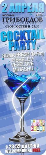 WELCOME DRINK (My House***) — это фирменый алко-коктейль, приготовленый по рецепту самого dj Fishelev’a, совместно с использованием секретов лучшего бармена клуба Грибоедов — Alex’a. Коктель My House*** - позволит Вам расслабиться и насладиться атмосферой праздника и веселья на лучшей хаус вечеринке города «My House Is Your House». dj’s: ROMA FRESH (D-Fm), FISHELEV, VESELOVE, MIHASHU. MY HOUSE IS YOUR HOUSE: — только самый качественный House Music, — самые модные и красивые люди, — душевная атмосфера, — эксклюзивность мероприятия. Сбор гостей: в 23-55. Вход: без списков — 300р., по спискам — 200р. с 23:55 до 01:00 — СВОБОДНЫЙ ВХОД ДЛЯ ДЕВУШЕК ПО СПИСКАМ !!! http://vkontakte.ru/event875451