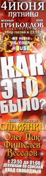 Новости / 24.00 “My House Is Your House” GRIBOEDOV CLUB — “КАК ЭТО БЫЛО”. Спец. гость — СЛАВЯНКА. Dj’s: Oleg Pak, Fishelev, Veselove